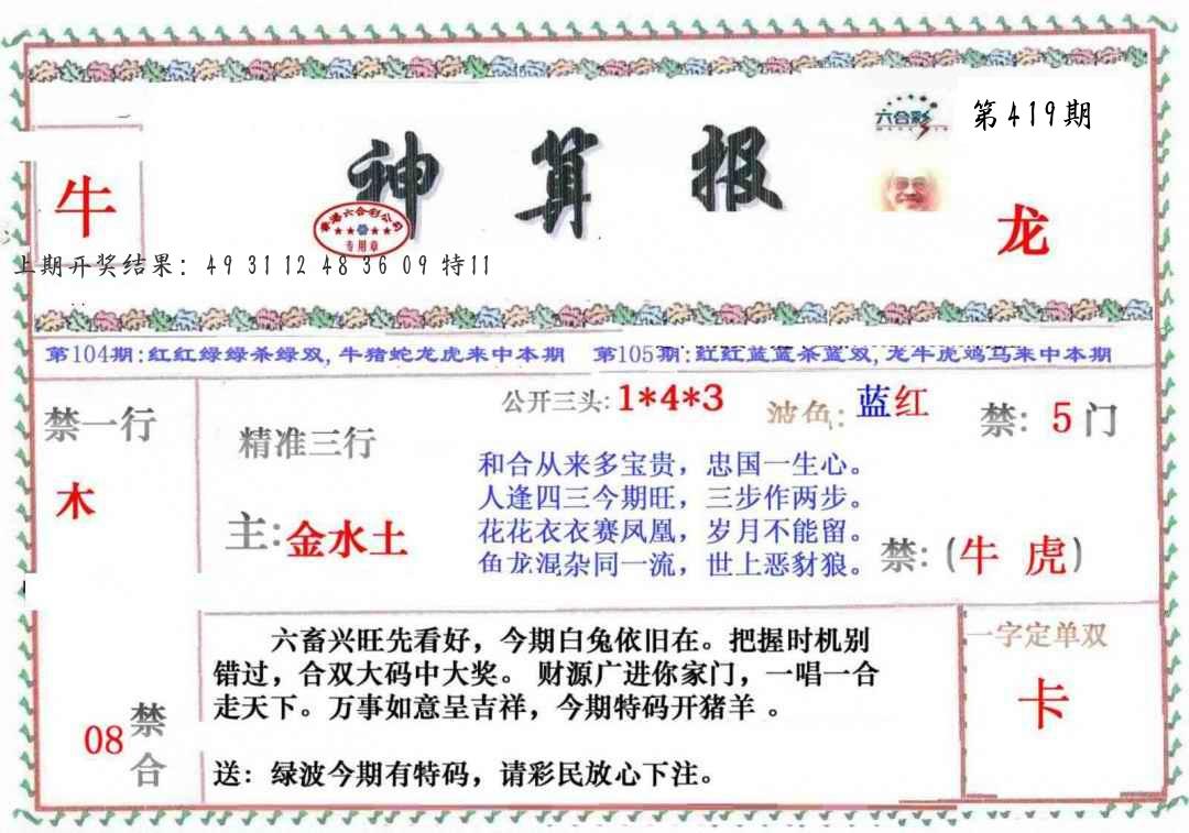 本期推荐一肖一码:( 牛30 )100%,中! |